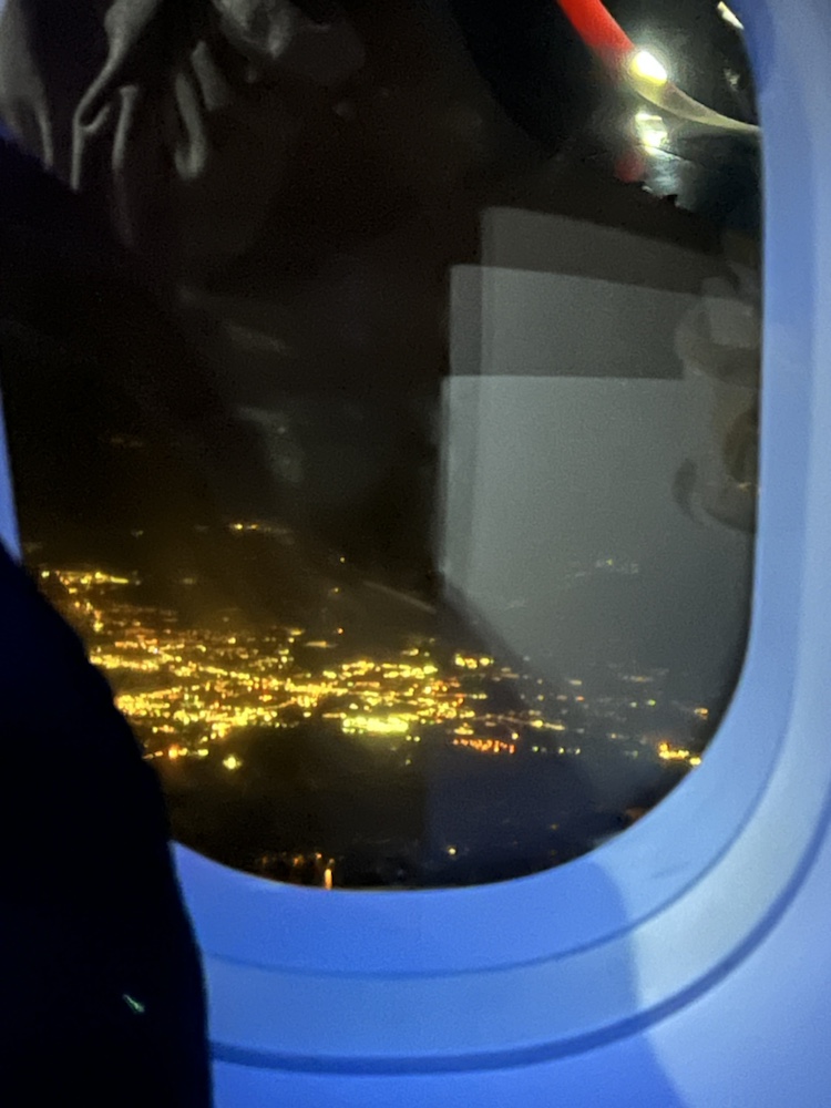 The plane was bumpy and I didn’t sleep at all, I sat in the middle of the seat and couldn’t see super well, but I did get a glimpse of the city lit. 10/10 view